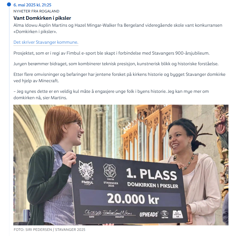Prosjektet har ikke bare bidratt til å gjøre jubileet relevant for ungdom – det har også vist hvordan digitale verktøy og engasjerende læringsformer kan være en døråpner for både lokal identitet og aktivt medborgerskap. Domkirken i Piksler er dermed et konkret eksempel på hvordan Stavangers historie kan gis nytt liv gjennom nyskapende samspill. For Fimbul e-sport, en lokal og liten e-sportklubb har det vært en stor ære å få være med og sette et ungt, kreativt og digitalt preg på jubileumsfeiringen. Vi er både stolte og takknemlige for å ha fått bidra til denne historiske markeringen, og takker Stavanger kommune for tilliten.